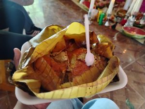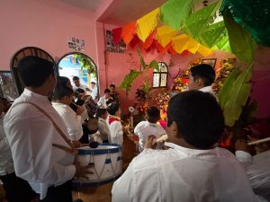 In the first home, volunteers helped prepare a Biguie’, a traditional altar made with fruits, bread, and flowers tied together. The family, grateful for their effort, offered tamales and bread as a gesture of reciprocity.